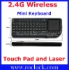 2.4G Mini Wireless Keyboard with Touchpad Features: * 2.4G wireless receiver integrated design * Touchpad 90-degree flip * Innovative design of the Navigation keys * Windows Multimedia Control * Built-in rechargeable lithium-ion battery * Laserpointer with remote control * With a real notebook Touchpad * Real QWERT full-function mini keyboard * Portable, elegant, lifestyle Specifications: * Max Operating distance: 30m * Model: DSSS model RF * Transmitting power: Max +4dBm * Working voltage: 3.3V * Working current: <150mA * Charge voltage: 4.2V 5.05V * Charge current: <350mA * Sleep current: <1mA * Dimension: 151*59*12.5mm * Net Weight: 200g * Color: black, white ,Black/silver optional System Supported: * Windows 2000, XP, Vista ,windows CE,windows 7 * Linux (Debian-3.1, Redhat-9.0 Ubuntu-8.10 Fedora-7.0 tested)