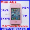 M168 4G Mini 4Gs Dual SIM Phone with Java and Dual Camera Mini M168 4GMini Java phone Specification:Model Number:M168 4G (4 pages Menu) Sale Points:Quad Band + Dual SIM Dual Standby + 2.6 inch Touch Screen + Dual 1.3M Camera + JAVA + Bluetooth + FM + Handshaking Frequency:GSM850/900/1800/1900Mhz Type:Dual SIM Dual Standby , Bar PhoneTV:NoBluetooth:Yes, Bluetooth 2.0FM:FM, need to plug in earphoneCamera:Dual Camera ,0.3M for front with flash light and 1.3M for Main Camera with flash lightDisplay:2.6 inch, 260k TFT Touch ScreenJava:Yes, Java 2.0Speaker:3D stereophonic systemMemory:With card slot / Support TF Card can up to 16GBSize:95(L) *53 (W) *9.5(H)mmWeight:about 100g (include battery)Battery:1800mAh (2 pcs) Standby time:About 150-250hoursTalk time:about 3-4hoursAvailable Color:Black, White, PinkMain function:Bluetooth , Java, Camera, DV ,FM, MP3/MP4, GPRS.Additional:Calendar, Calculator, Clock, Notes, Unit Converter, Currency Converter, E-book Reader, Game, Facebook , MSN, Yahoo! Messenger, skype, Alarm , World Clock , Stopwatch.Multi-languages: (Optional)English, French, Spanish, Portuguese ,Italian, Deutsch, Bahasa Indonesia, Bahasa Melayu, Tieng Viet , Turkce , Russian, Arabic , Thai .Accessories:1x Stereo earphone,1x charger, 1x data cable, 2x batteries , user manual(English).